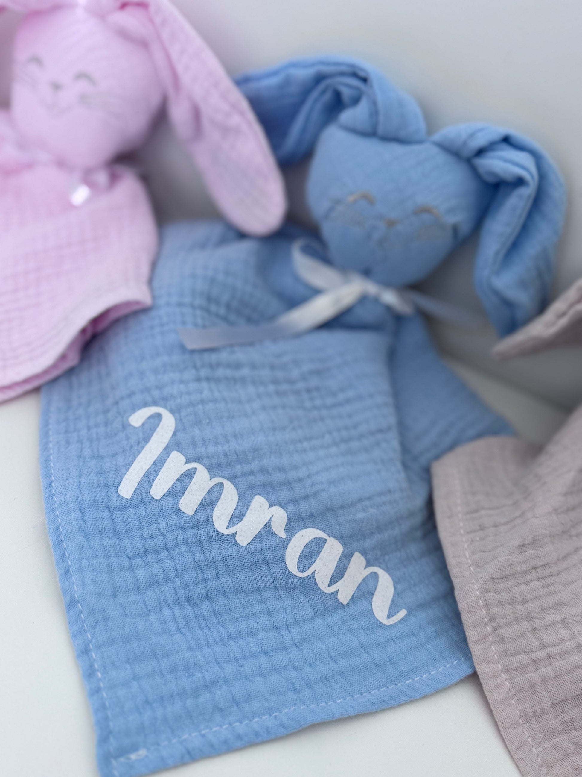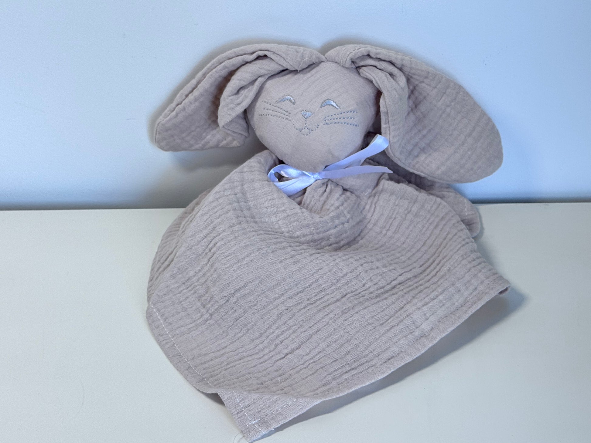 Notre doudou lapin bébé en gaze de coton est doux, léger et parfait pour les câlins. Personnalisable avec le prénom de bébé, il devient un cadeau naissance unique et précieux. Idéal pour la maison, la poussette ou comme cadeau baby shower, ce doudou coton bébé allie confort, sécurité et douceur naturelle.
